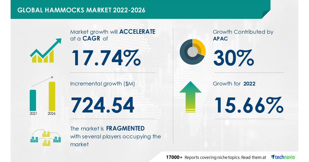The hammocks market dimension is predicted to develop by USD 724.54 million from 2021 to 2026. In addition, the expansion momentum of the market will speed up at a CAGR of 17.74% through the forecast interval, in accordance to Technavio.