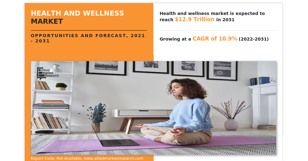 PUNE, MAHARASHTRA, INDIA, February 23, 2023 /EINPresswire.com/ — Allied Market Research has published a study report with the title Health and Wellness Market Size was Valued at USD 4,712.5 billion in 2021 and is Projected to Garner USD 12,850.3 billion by 2031, registering a CAGR of 10.9% from 2022 to 2031.
