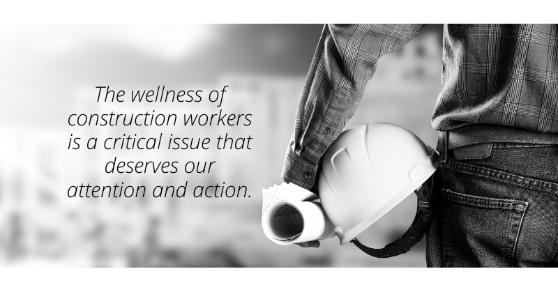 image of a person holding a construction hat and architecture drawings with text reading “The wellness of construction workers is a critical issue that deserves our attention and action.”