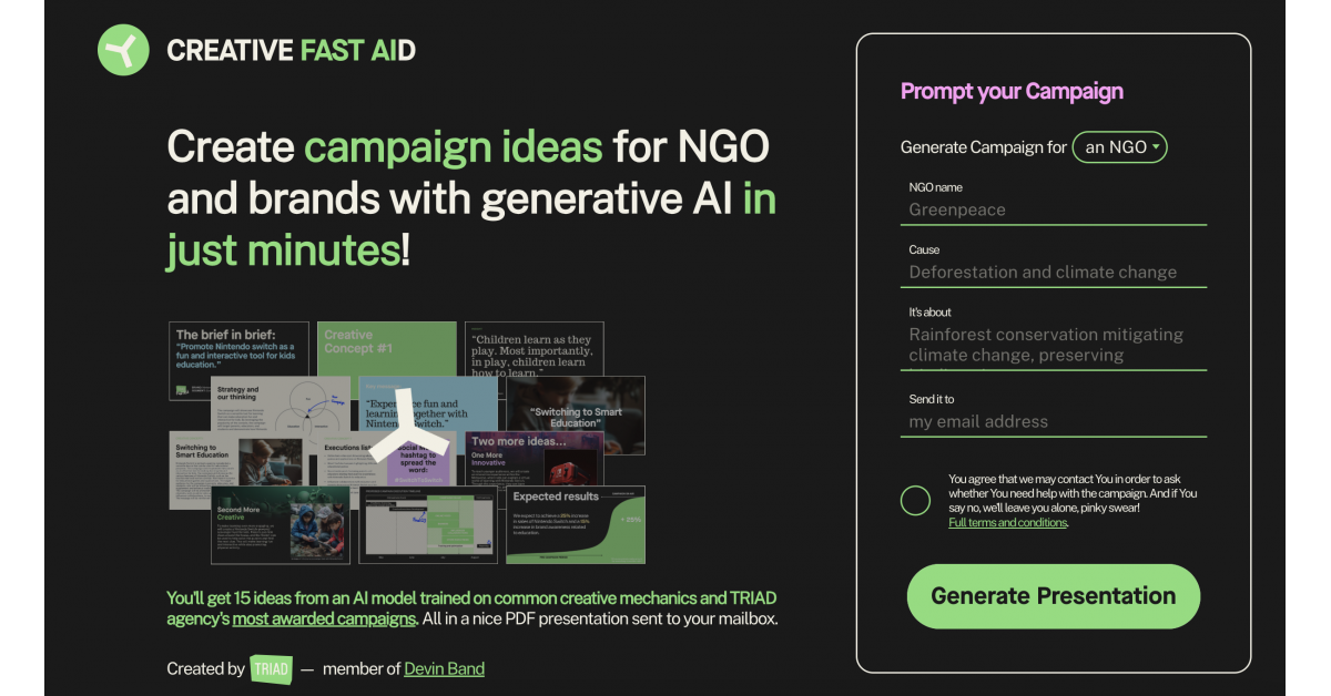 Creative Fast AID is designed to generate quick creative concepts and serve as a source of inspiration for marketers. The app can generate a complete campaign presentation for the specified brand using typical creative techniques used in advertising. The presentation includes insights, strategy design, execution list, generated visuals, headlines, timeline and even estimated results. In addition, it includes a wealth of ideas following common creative practices.