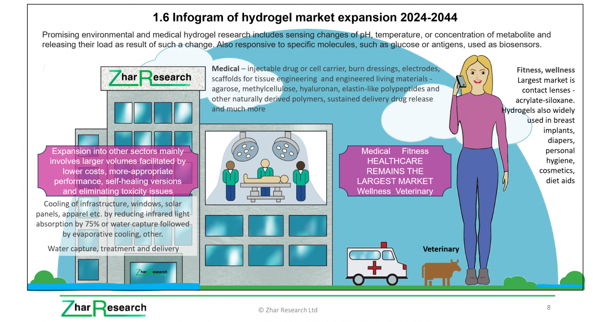 Infogram of hydrogel market expansion 2024-2044. Source Zhar Research report, ““Hydrogels: Future Technologies and Markets 2024-2044”.
