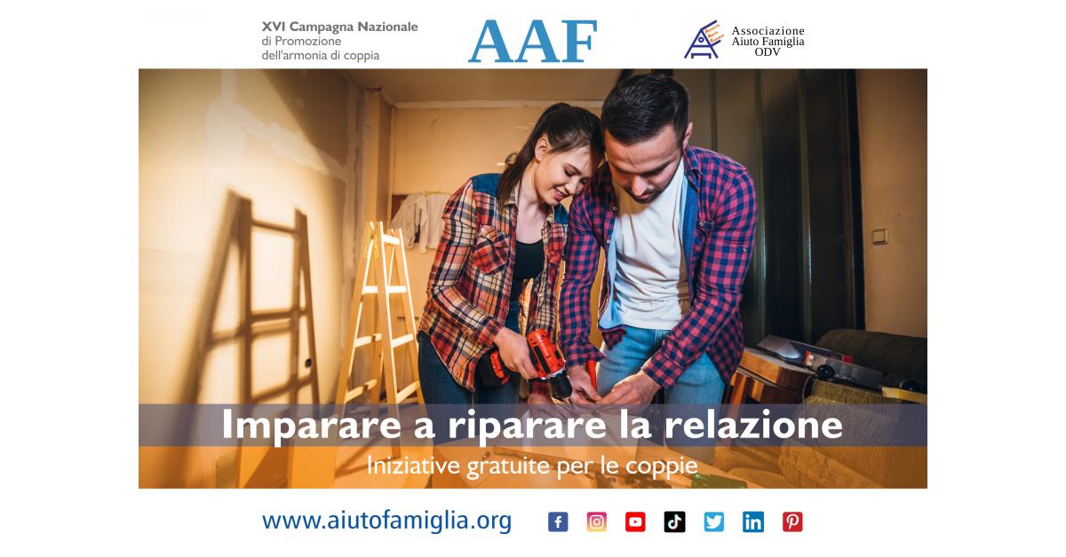 L’invito ad aderire alle iniziative proposte da AAF – Associazione Aiuto Famiglia è rivolto a tutte le coppie, anche a quelle che non hanno problemi conclamati. “Spesso le persone arrivano da noi nell’emergenza, quando l’aiuto diventa più difficile. Invito ogni coppia a partecipare alle nostre numerose proposte, tutte gratuite e di comprovata efficacia. La felicità di coppia non è scontata, ma va costruita con impegno, dialogo e dedizione.”