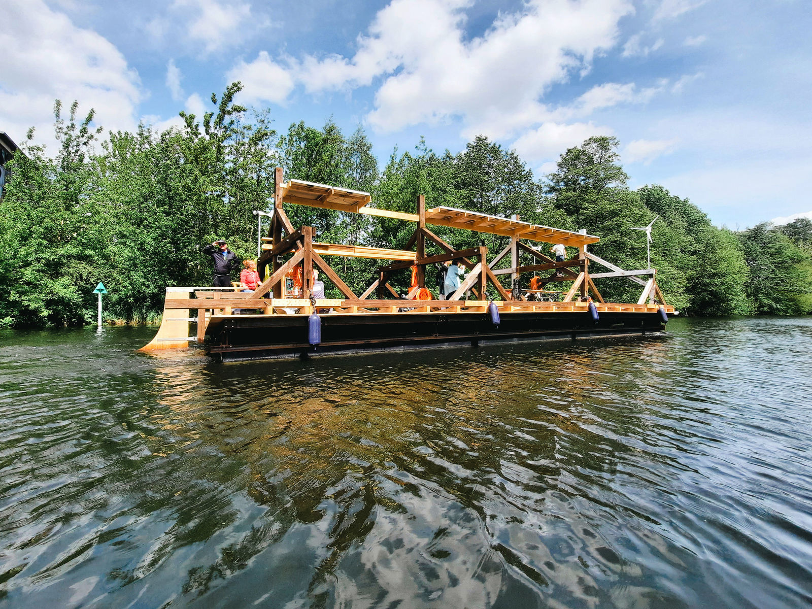 For a whole decade, the artists of the Berlin-based collective KUNSTrePUBLIK had worked together in Berlin-Moabit under the roof of their institution ZK/U – Center for Art and Urbanistics. Now, the wooden structure of the saddle roof has been removed and turned upside down to create a work for documenta fifteen. Converted into a ship and charged with cultural energy, the watercraft departs for a journey focussing on sustainability, inspring encounters and the power of community.
