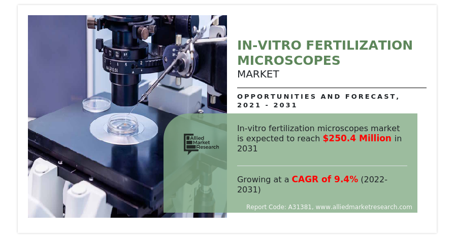 PORTLAND, OREGON, UNITED STATES, June 2, 2023/EINPresswire.com/ — Allied Market Research published a report, titled, “In-Vitro Fertilization Microscopes Market by Type (Upright Microscopes, Inverted Microscopes, Stereo Microscopes, Embryo Microscope), by End User (Clinical, Academic Research): Global Opportunity Analysis and Industry Forecast, 2021-2031”. According to the report, the global in-vitro fertilization microscopes industry In-vitro fertilization (IVF) Market Size was Valued at USD 105.4 million in 2021 and is Projected to Garner USD 250.4 million by 2031, registering a CAGR of 9.4% from 2022 to 2031.