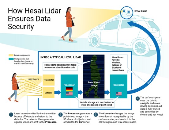 Hesai lidars do not – indeed cannot – pose a national security or privacy threat. They do not have wireless, cellular, or Bluetooth capabilities. Data transmission is one-way only via a secure cable from the lidar to the vehicle; the data never returns to the lidar. Hesai lidars do not have the memory and mechanism to store even a second of an image. Simply put, Hesai lidars are superior devices that allow a vehicle to sense its surroundings, enhancing safety and reliability, but they do not store information. The vehicles’ onboard computer owns all of the data and Hesai owns no data. In fact, Hesai is the first lidar company in the world that has been certified by ISO 21434 for high automotive cybersecurity. Please see the infographic below that explains how data is securely transmitted to the vehicle: