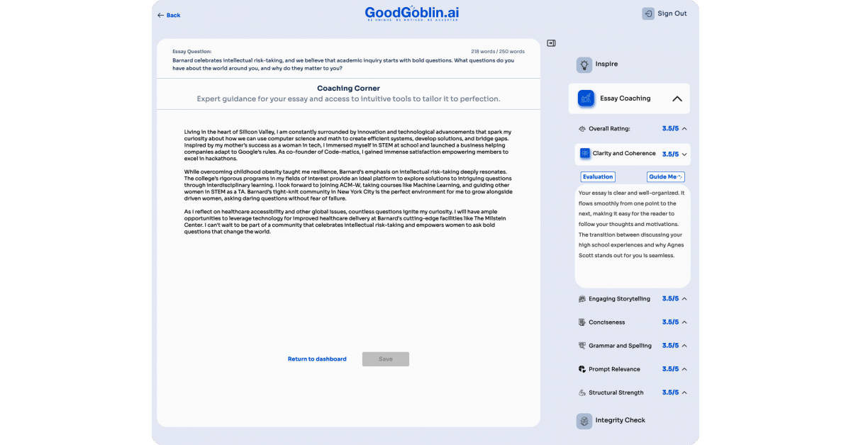 SAN JOSE, CALIFORNIA, UNITED STATES, October 23, 2023 /EINPresswire.com/ — Charting new territories at the intersection of student initiative and advanced AI, GoodGoblin.ai proudly unveils its groundbreaking Expert Essay Coaching feature. Specifically designed for do-it-yourself (DIY) scholars, this feature stands as a refined essay guide, offering instant, comprehensive feedback and actionable insights tailored to distinct college prompts.