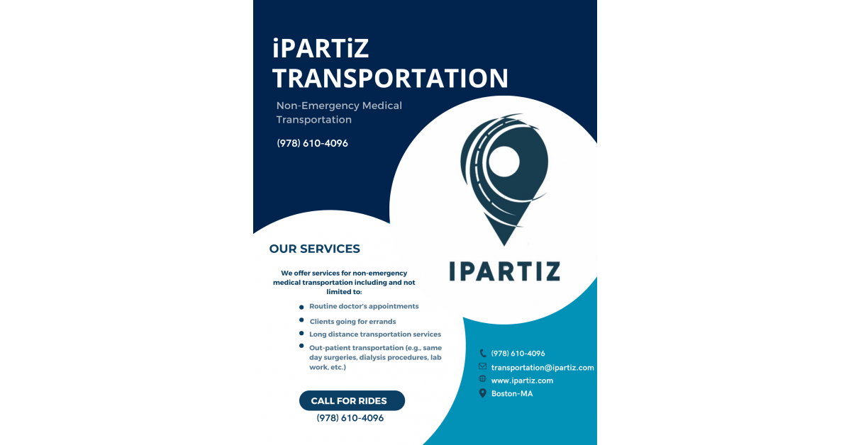 LOWELL, MA, USA, April 13, 2023/EINPresswire.com/ — iPARTiZ Transportation, a new transportation company based out of Lowell, MA, is making waves in Middlesex County, Massachusetts, and beyond. With a focus on non-emergency medical transportation, iPARTiZ offers a unique and much-needed service to the community.But that’s not all. iPARTiZ also provides transportation for routine doctor’s appointments, clients going for errands and recreation, door-to-door transportation, and wheelchair accessibility. The company’s services are tailored to meet the needs of its customers, ensuring their comfort, safety, and satisfaction.