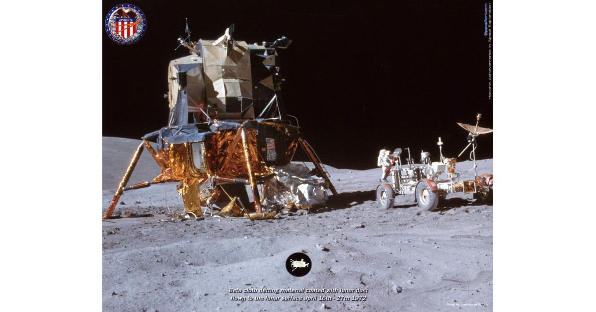 Apollo 16 flight-flown beta material netting materials coated with lunar mud from its journey to the lunar floor April 16-27, 1972, affixed to a photographic show (est. $800-$1,200).