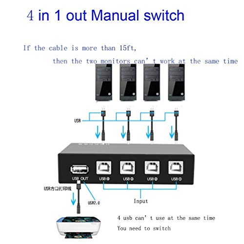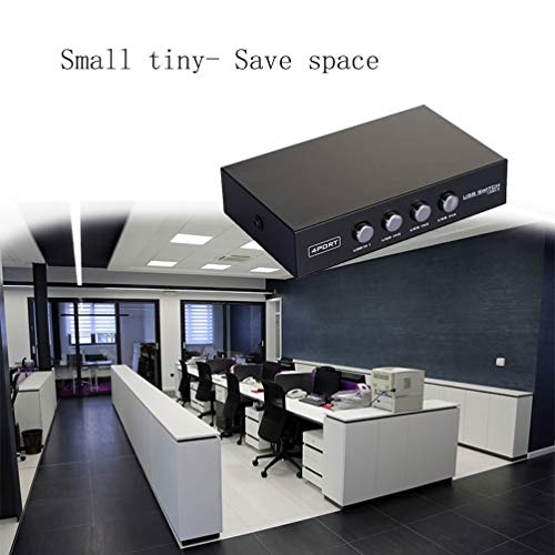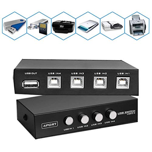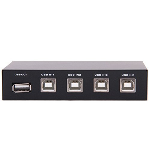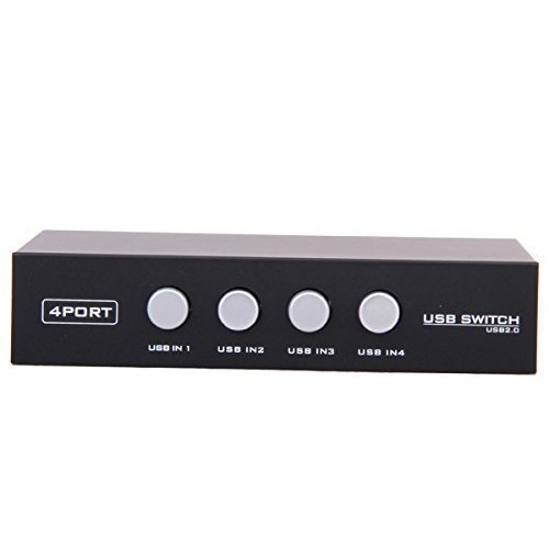 This 4 Ports USB 2.0 Sharing Switch can let you make 4 computers access to one single USB compliant device. It is convenient to switch, just press the relative button. No additional software.The 4 Ports USB 2.0 Sharing Switch is new and high quality. There are 4 USB ports, 4 in 1 out. it enables 4 computer to share 1 USB compliant device such as Printer or Scanner.The adaptor is no need of external power, because the USB port and the adaptor’s internal can supply. And there are also four press button switches for changing the USB signal control. It’s very convenient for you and no need of removing one USB signal when you use another one.This 4 Ports Sharing Switch is USB 2.0 standard, compatible with USB 1.1 and USB 2.0. Its simple but Cost-effective design makes it specially convenient for small business and home to manage network layout.