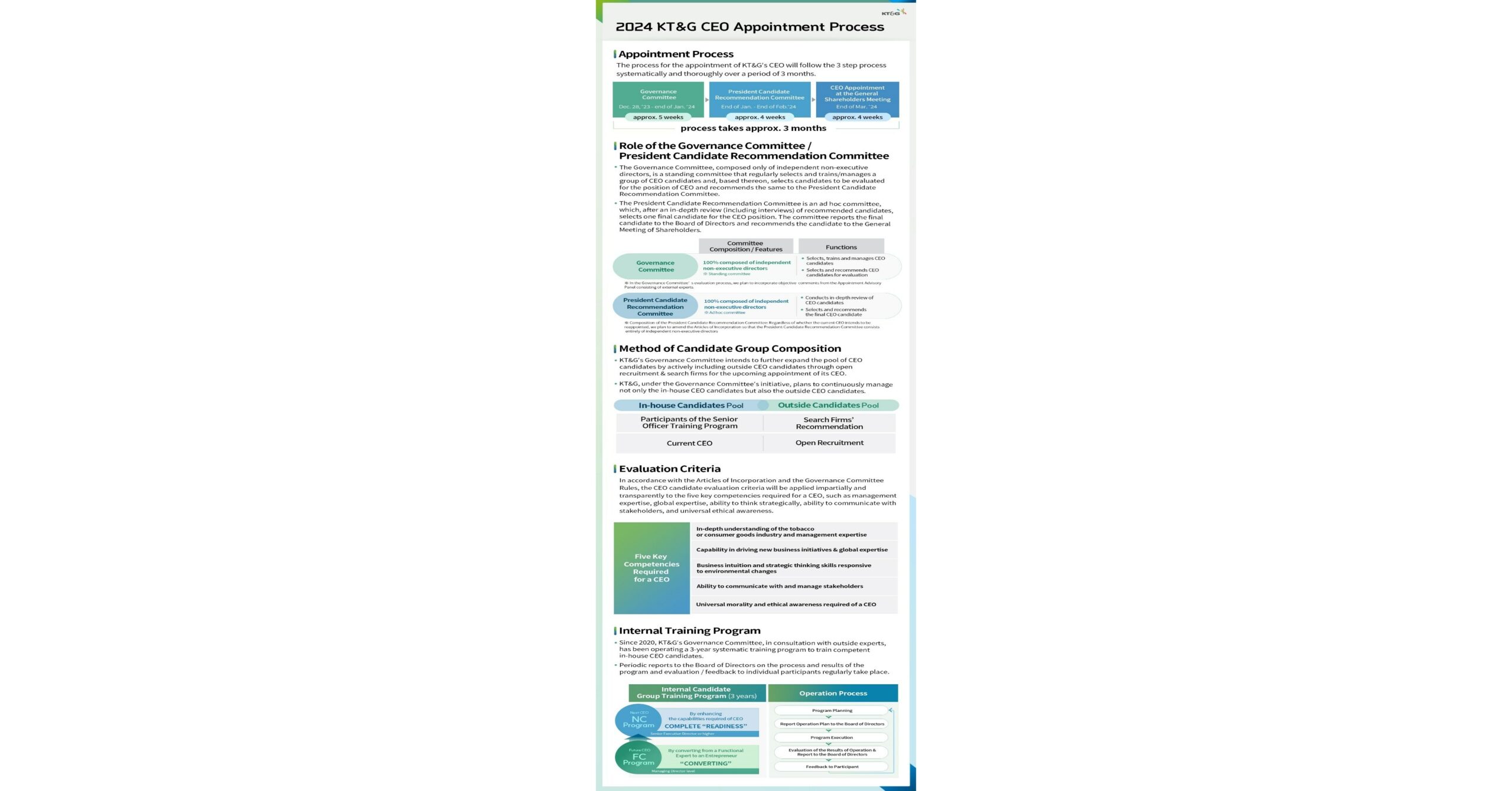 During the meeting, KT&G Board of Directors and the Governance Committee engaged in comprehensive discussion concerning the procedure for selecting candidates to be evaluated for the CEO position and the evaluation criteria. The external CEO candidate pool will be drawn from a combination of open recruitment and search firm recommendations, securing a wide array of candidates who meet the qualifications. The internal CEO candidate pool will include individuals who have participated in the Senior Management Training Program that has been in operation since 2020, as well as the incumbent CEO. The Governance Committee will impartially assess both the external and internal pools to establish the longlist for CEO candidates.