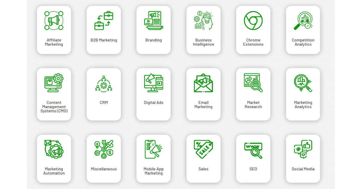 This easy-to-use platform features over 1000 marketing and AI tools, under 19+ marketing categories covering everything from social media to content creation, email marketing, SEO, and more.