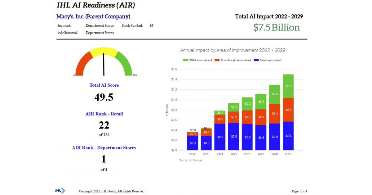 NASHVILLE, TN, UNITED STATES, December 1, 2023 /EINPresswire.com/ — Department store chain Macy’s, Inc. could see over $7.5 billion in business improvements by the end of the decade due to Artificial Intelligence (AI) according to new research from IHL Group, a leading technology research and advisory firm. The Retail AI Readiness Profiles research nearly 200 North American public retailers and restaurant chains, evaluates the companies based on AI Readiness, providing invaluable insights into the potential impact AI can bring to their organizations.