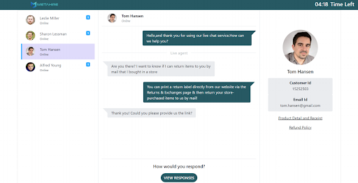 The Live Chat Support Simulation offers candidates an accurate representation of the Live Chat Support Agent role. During the application process, candidates handle multiple real-time support requests from clients with various personalities and cover different topics. Metahire.ai grades their performance based on Live Chat Support KPIs, such as Average Handle Time, Service Level, Adaptability, Customer Focus, and Multitasking, among others.