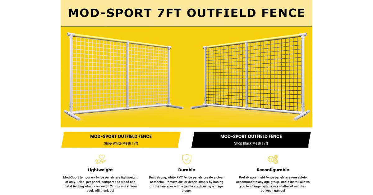 The new Mod-Sport 7ft Outfield Fence is designed to provide customers with a durable, yet lightweight outfield fence solution for games and leagues of all sizes. Mod-Sport is built for quick install and break down in just a matter of minutes without any tools and can be used over and over again to accommodate any age group.
