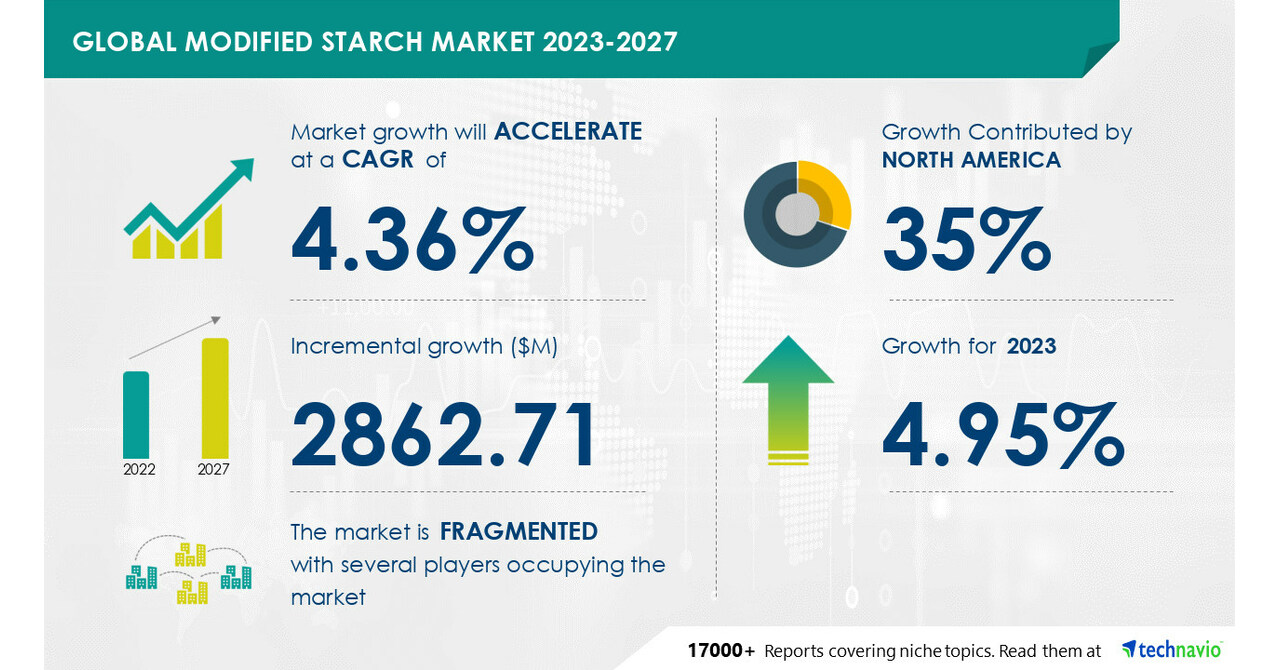 NEW YORK, Oct. 31, 2023 /PRNewswire/ — The global modified starch market size is estimated to increase by USD 2.86 billion from 2022 to 2027. The market’s growth momentum will decelerate at a CAGR of 4.36%. The report provides actionable insights and estimates the contribution of all regions to the growth of the global modified starch market. North America is estimated to account for 35% of the growth of the global market during the forecast period. The demand for modified starch in the region is expected to be moderate during the forecast period. The most commonly used modified starch in North America is glucose syrup. In addition, the demand for maltodextrin is growing significantly in the region. Moreover, native starch is available in abundance. North America is a leading producer of modified starch. In addition, the demand for corn starch is increasing owing to its cost-effectiveness. Such factors will fuel market growth in the regional market during the forecast period. Discover some insights on market size, historic period (2017 to 2021), and forecast period (2023-2027) before buying the full report – Request a sample report