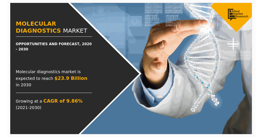 Allied Market Research published a report, titled, “Molecular Diagnostics Market by Type (Instruments, Reagents, Software & Services), by Technology (Polymerase Chain Reaction (PCR), Hybridization, DNA sequencing, Microarray, Isothermal Nucleic Acid Amplification Technology (INAAT), Others), by Application (Infectious diseases, Oncology, Genetic testing, Blood screening, Others), by End User (Hospital, Reference Laboratories, Others): Global Opportunity Analysis and Industry Forecast, 2020-2030. According to the report, the global molecular diagnostics industry was estimated at USD 9.2 billion in 2020, and is anticipated to hit USD 23.9 billion by 2030, registering a CAGR of 9.86% from 2021 to 2030.