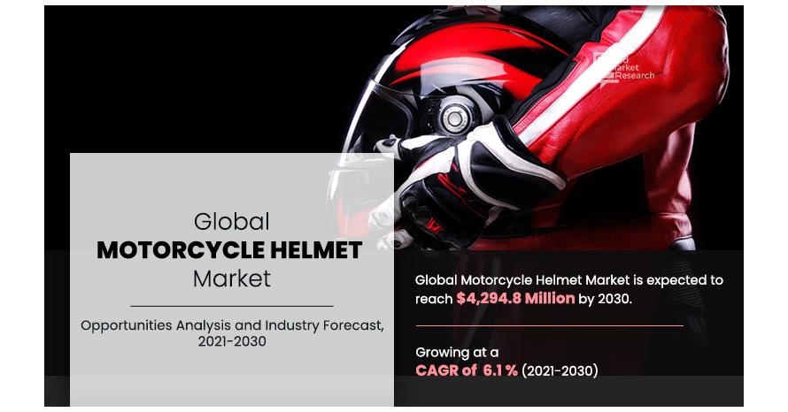 The global motorcycle helmet market size was valued at $2,444.5 million in 2020, and is projected to reach $4,294.8 million by 2030, registering a CAGR of 6.1% from 2021 to 2030. Motorcycle helmet is worn by motorcyclists to protect their heads while riding. The primary aim of a motorcycle helmet is to keep the rider’s head safe during accidents and preventing head injuries. Helmets are available in a variety of styles and comfort levels to meet the needs of customers. Enforcement of stringent government road safety laws for riders and increase in awareness of head injuries are the crucial factors that drive the growth of the global motorcycle helmet market. All these motorcycle helmet market trends propel the market growth.