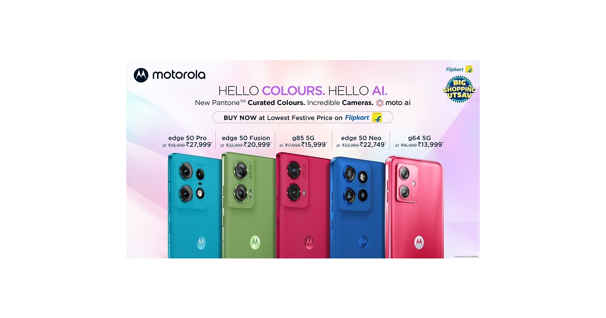 Motorola, a global leader in mobile technology and innovation recently announced massive festive discounts and introduced new color variants for their most popular smartphones across price segments, during Flipkart’s Big Billion Days Sale. Motorola also introduced new colours as part of its “Hello Colours, Hello AI” campaign showcasing its unique design and colour language in premium, stylish, and vibrant smartphones. The new colours are available in the motorola edge50 Pro, motorola edge50 Fusion, motorola edge50 Neo, moto g85 5G, and moto g64 5G and can be availed on Flipkart.com. The products will also be on sale starting tomorrow for the Big Shopping Utsav Sale exclusively on Flipkart and will be available at special festive pricing till 13th Oct 2024.