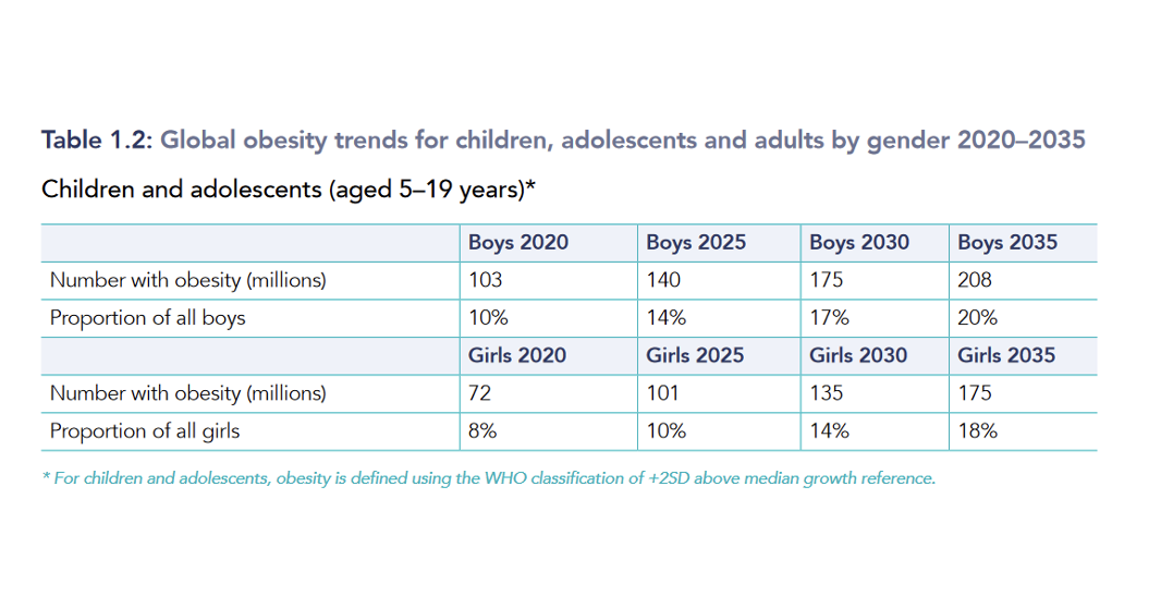 By 2035, it is expected that 51% of the global population will be living with overweight or obesity based on current trends. When it comes to children, the numbers are even more alarming. There is a projected doubling of the overweight rate among boys to 208 million (an increase of 100%) and more than a doubling of the rate among girls to 175 million (an increase of 125%). These rates are growing faster in children than in adults.