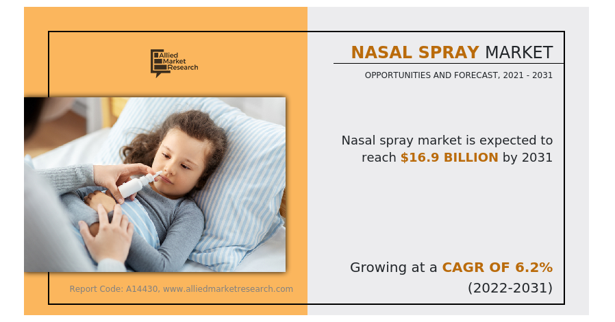 PORTLAND, OREGON, UNITED STATES, October 23, 2023 /EINPresswire.com/ — Nasal spray market size was valued at $9.2 billion in 2021, and is estimated to reach $16.9 billion by 2031, growing at a CAGR of 6.2% from 2022 to 2031.The nasal spray market trends that drive the growth of the market include advantages associated with a nasal spray such as easy administration and easy refill of the medicines.