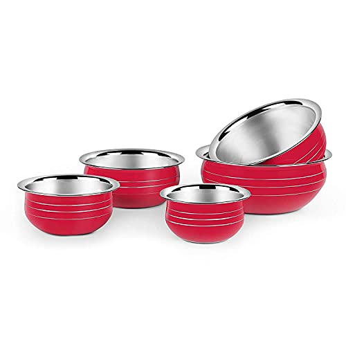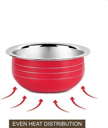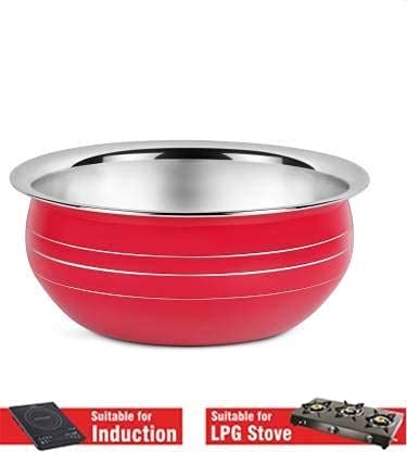 Nirvika STAINLESS STEEL HANDI Product Description :- Package Contents 5 Piece Stainless Steel colorful Handi Capacity 350 ML to 1650 ML This Handi / chetty comes with a curved steel plated base that helps distribute heat evenly and quickly throughout the surface. In addition, this chetty is perfect to be used on gas stoves These handi Set have enough space for cooking and storing milk, tea, vegetable curries, curd etc. Durable & Heavy Duty, not Induction compatible EXPORT QUALITY Heavy-gauge Stainless Steel, Deep vessel height is useful to cook more food. Available in multiple sizes according to need of kitchen. Easy to clean and wash, they have very exotic silver shining. Highly durable and made of fine quality stainless steel. Fine finish String construction Made using best grade steel In-tandem with established quality standards Easy to clean and wash, they have very exotic silver shining. Nirvika started with a prime focus on providing Quality Stainless Steel Kitchenware, Houseware, Cookware and Hotelware products.At Nirvika export products are designed and manufactured with our full understanding of the product’s use. Material: Stainless Steel , Non-Magnetic.