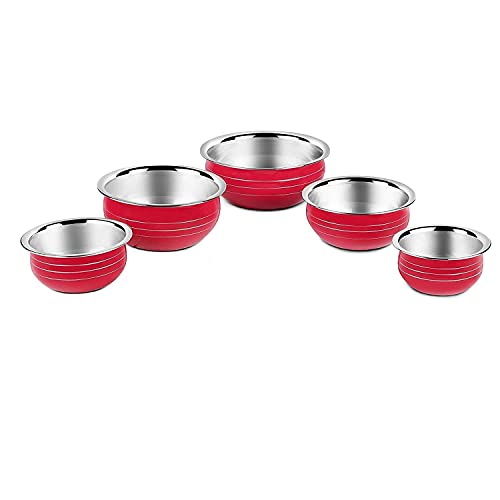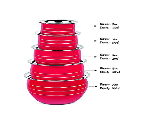 Capacities of 350 ML, 550 ML, 750 ML, 1200 ML, 1650 ML pack of 5. Package Contents Five Piece Of Red Color Handi Sets Easy to clean and wash, Durable as a daily serve ware set