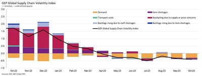 CLARK, N.J., Nov. 15, 2023 /PRNewswire/ — The GEP Global Supply Chain Volatility Index — a leading indicator tracking demand conditions, shortages, transportation costs, inventories and backlogs based on a monthly survey of 27,000 businesses — decreased again in October to -0.41, from -0.35 in September, indicating a 7th successive month of rising spare capacity across the world’s supply chains. Additionally, the extent to which supplier capacity went underutilized was even greater than in September and August. Coupled with October’s downturn in demand for raw materials, components and commodities, this shows rising slack in global supply chains.