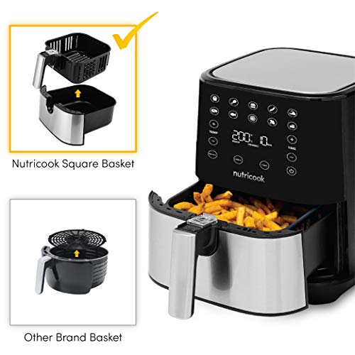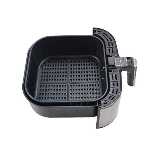 Premium air fry basket. PFOA-free, BPA-free, non stick coating and dishwasher safe. It has more usable space to put more food than a round design basket.