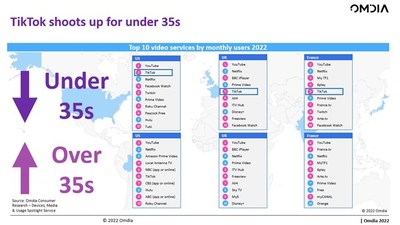 LONDON, Oct. 18, 2022 /PRNewswire/ — New analysis from Omdia exhibits that TikTook has leapfrogged Netflix to turn into the second most popular service in the USA, with solely YouTube retaining the crown for under 35s viewing. The service stays closely skewed by age and occupies sixth place for above 35 years outdated. The outcomes from Omdia’s newest client survey had been introduced by Omdia’s Senior Director Maria Rua Aguete at MIPCOM this week.
