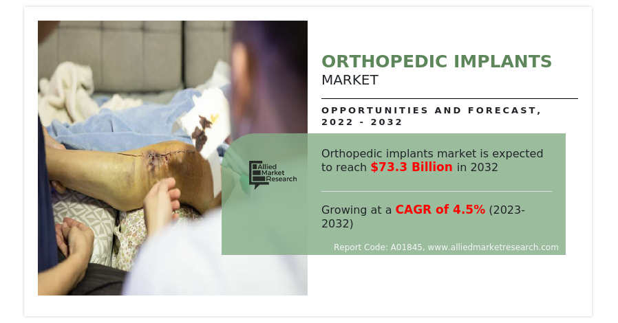 Allied Market Research published a report, titled, ” Orthopedic Implants Market by Product Type (Reconstructive Joint Replacements, Spinal Implants, Dental Implants, Trauma, Orthobiologics, Others), by Biomaterial (Metallic Biomaterials, Ceramic Biomaterials, Polymeric Biomaterials, Others), by Type (Knee, Hip, Wrist, and Shoulder, Dental, Spine, Ankle, Others): Global Opportunity Analysis and Industry Forecast, 2022-2032.” According to the report, the global Orthopedic Implants Market Size was Valued at USD 47.19 billion in 2022 and is Projected to Garner USD 73.32 billion by 2032, registering a CAGR of 4.5% from 2023 to 2032.