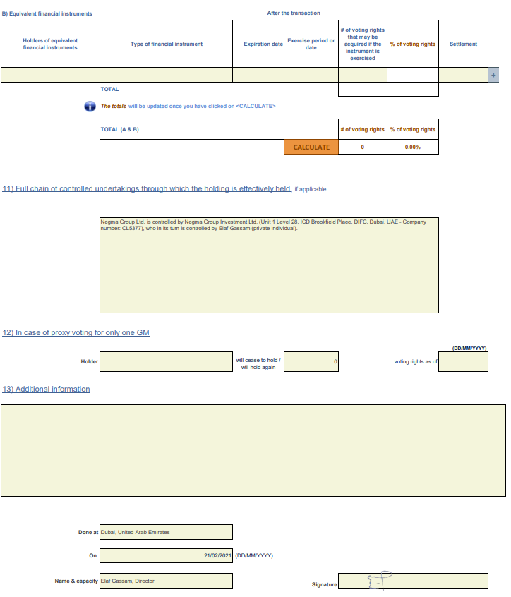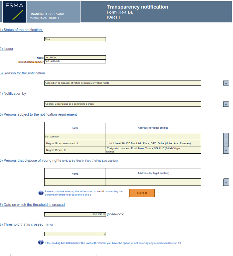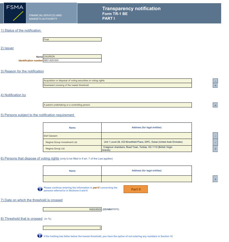 Oxurion received a transparency notification on February 21, 2023 from Negma Group Ltd. indicating that as of February 15, 2023, it held 35,314,661 shares of the then outstanding 564,210,937 shares, and therefore crossed above the threshold (5%) by virtue of acquisition of voting securities. See Annex 2