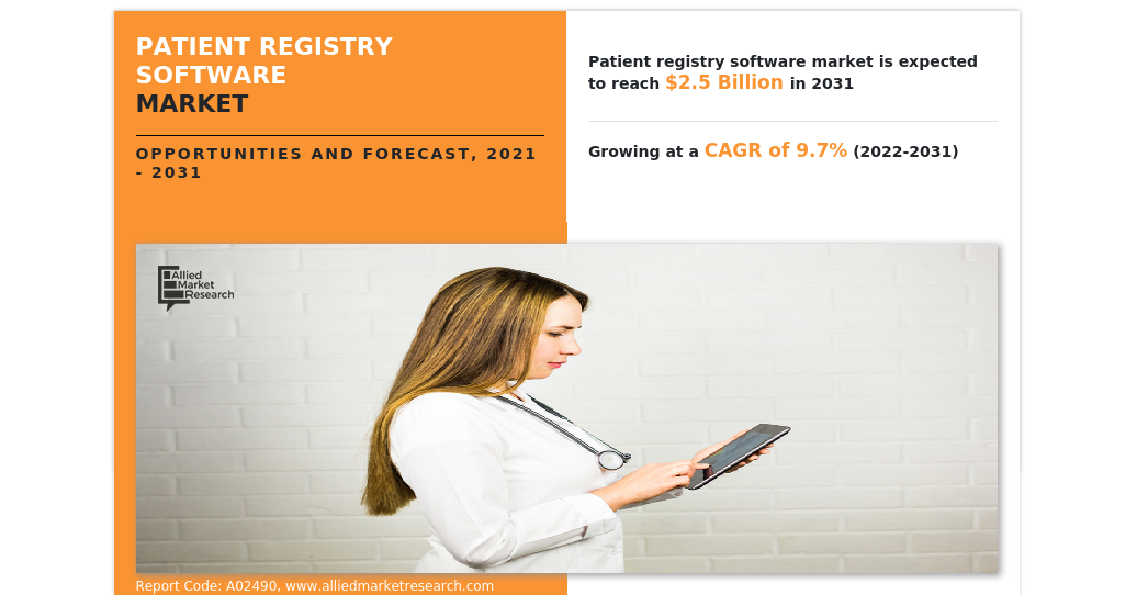 PORTLAND, OR, UNITED STATES, July 1, 2023/EINPresswire.com/ — Allied Market Research Analyst have added a new research study on Title Patient Registry Software Market, Global Outlook and Forecast 2023-2030 with detailed information & Key Players Such as Conduent, Dacima Software, Elekta, FIGmd, IBM, ImageTrend, IQVIA, McKesson, OpenText, Optum, Ordinal Data, Premier. The Study provides in-depth comprehensive analysis includes Clear Market definitions, classifications, manufacturing processes, cost structures, development policies and plans. The patient registry software market was valued at $993.28 million in 2021, and is estimated to reach $2,508.27 million by 2031, growing at a CAGR of 9.7% from 2022 to 2031.