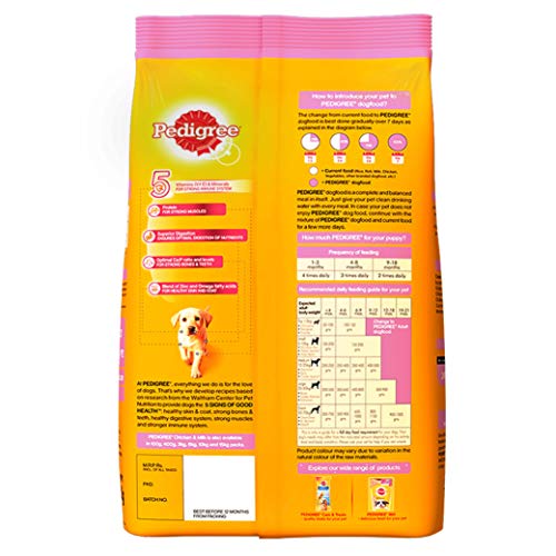 PEDIGREE complete and balanced dog food for puppies is a wholesome meal packed with essential nutrients vital to the healthy growth of your pet. PEDIGREE, with the goodness of cereals, chicken, meat, and the nutrients blend into a tasty and healthy treat for your little one. With PEDIGREE, you are sure to see the 5 Signs of Good Health in your pet if you feed him as per the given feeding guidelines. These signs include improved natural defence (from Vitamins (Vit E) and Minerals); Strong Muscles (from Protein); Optimal Digestion of Nutrients; Strong Bones and Teeth (from Ca:P ratio & levels); Healthy Skin and Coat (from blend of Zinc and Omega Fatty Acids). At PEDIGREE recipes are developed based on research from the Waltham Centre for Pet Nutrition. Every product from PEDIGREE surpasses the requirements laid down by NRC 2006 of the U.S. National Academy of Science.