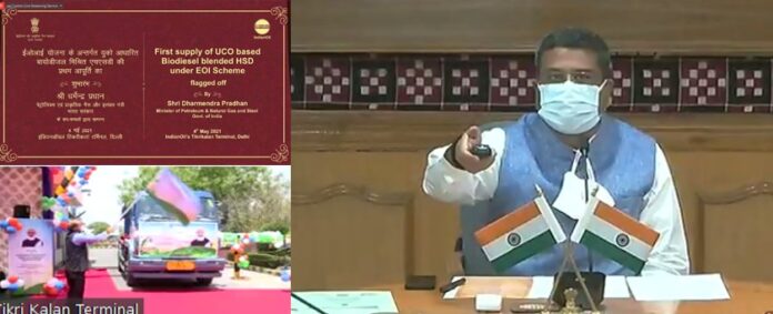 Minister of Petroleum & Natural Gas and Steel, Shri Dharmendra Pradhan, remotely flagged off the first supply of UCO (Used Cooking Oil) based Biodiesel blended Diesel under the EOI Scheme from IndianOil’s Tikrikalan Terminal. Secretary, Ministry of Petroleum & Natural GasShri Tarun Kapoor and Chairman, IndianOil Shri S M Vaidya, were also present on the occasion.
