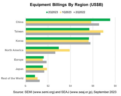 MILPITAS, Calif., Sept. 6, 2023 /PRNewswire/ — Global semiconductor equipment billings dipped 2% year-over-year to US$25.8 billion in the second quarter of 2023, while quarter-over-quarter billings slipped 4%, SEMI announced today in its Worldwide Semiconductor Equipment Market Statistics (WWSEMS) Report.
