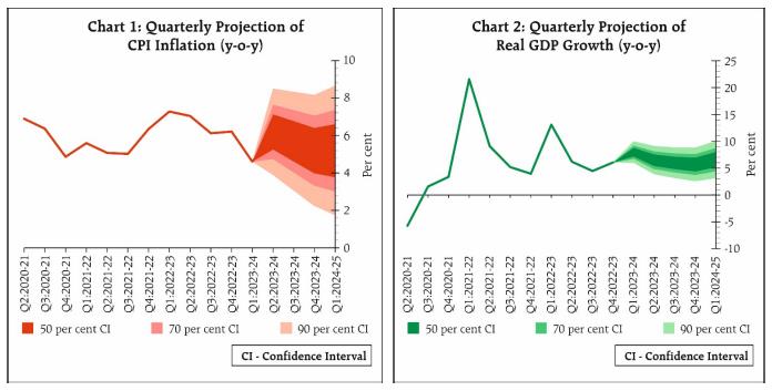 12. Going forward, the spike in vegetable prices, led by tomatoes, would exert sizeable upside pressures on the near-term headline inflation trajectory. This jump is, however, likely to correct with fresh market arrivals. There has been significant improvement in the progress of the monsoon and kharif sowing in July; however, the impact of the uneven rainfall distribution warrants careful monitoring. Crude oil prices have firmed up amidst production cuts. Manufacturing, services and infrastructure firms polled in the Reserve Bank’s enterprise surveys expect input costs to ease but output prices to harden. Taking into account these factors and assuming a normal monsoon, CPI inflation is projected at 5.4 per cent for 2023-24, with Q2 at 6.2 per cent, Q3 at 5.7 per cent and Q4 at 5.2 per cent, with risks evenly balanced. CPI inflation for Q1:2024-25 is projected at 5.2 per cent (Chart 1).