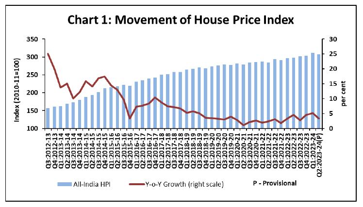 All-India HPI growth (y-o-y) moderated to 3.4 per cent in Q2:2023-24 from 5.1 per cent in the previous quarter and 4.5 per cent a year ago; annual growth in HPI varied widely across the cities – ranging from the high growth of 6.5 per cent (Chennai) to a contraction of 0.2 per cent (Jaipur).