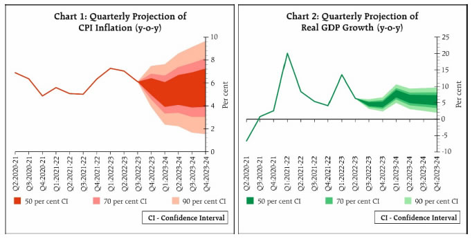 8. The outlook for inflation is mixed. While prospects for the rabi crop have improved, especially for wheat and oilseeds, risks from adverse weather events remain. The global commodity price outlook, including crude oil, is subject to uncertainties on demand prospects as well as from risks of supply disruptions due to geopolitical tensions. Commodity prices are expected to face upward pressures with the easing of COVID-related mobility restrictions in some parts of the world. The ongoing pass-through of input costs to output prices, especially in services, could continue to exert pressures on core inflation. The Reserve Bank’s enterprise surveys point to some softening of input cost and output price pressures in manufacturing. Taking into account these factors and assuming an average crude oil price (Indian basket) of US$ 95 per barrel, inflation is projected at 6.5 per cent in 2022-23, with Q4 at 5.7 per cent. On the assumption of a normal monsoon, CPI inflation is projected at 5.3 per cent for 2023-24, with Q1 at 5.0 per cent, Q2 at 5.4 per cent, Q3 at 5.4 per cent and Q4 at 5.6 per cent, and risks evenly balanced (Chart 1).