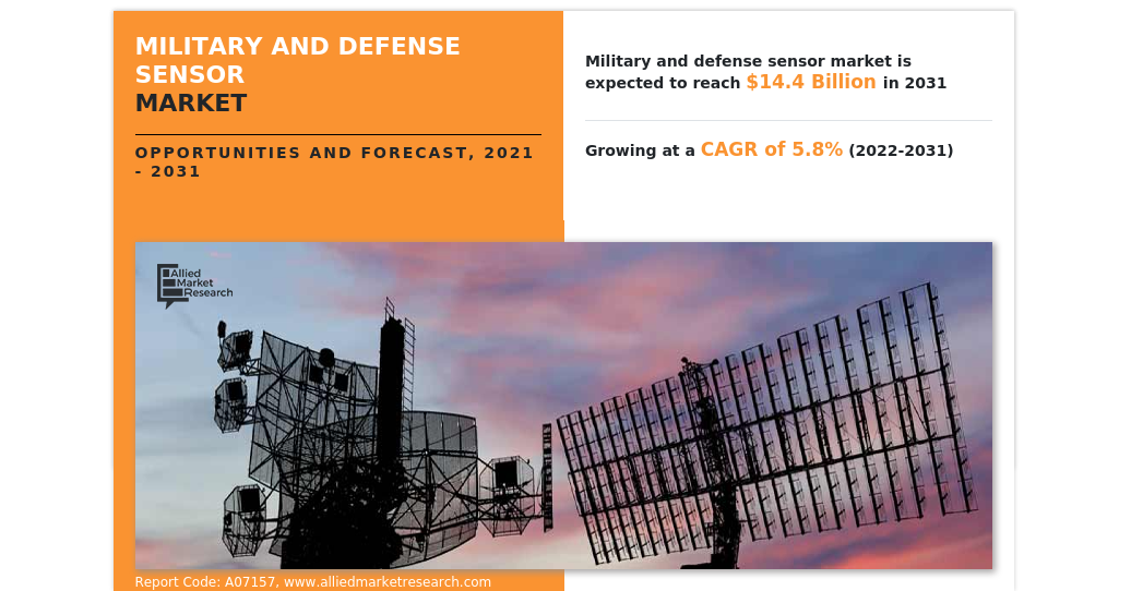 According to a new report published by Allied Market Research, titled, “Military and Defense Sensor Market” was valued at $8.3 billion in 2021, and is estimated to reach $14.4 billion by 2031, growing at a CAGR of 5.8% from 2022 to 2031.