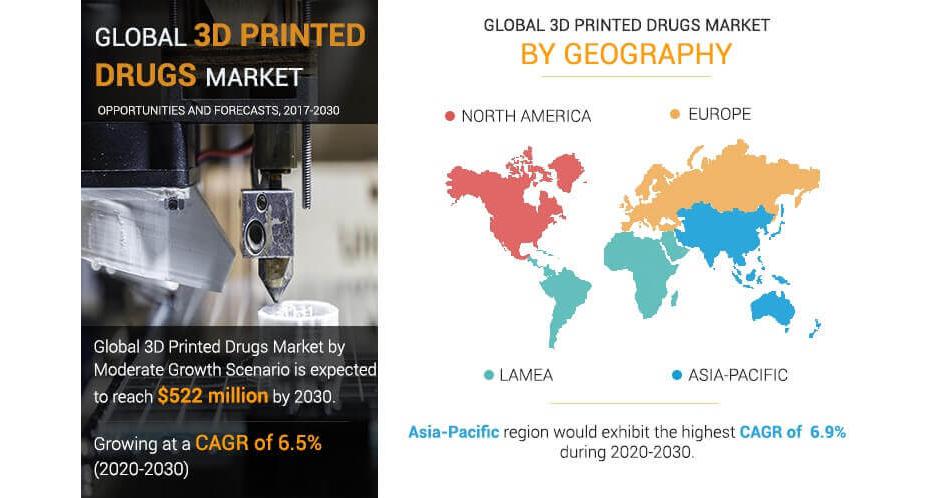 Allied Market Research has published a study report with the title 3D Printing Drugs Market Size was Valued at USD 278 Million in 2020 and is Projected to Garner USD 522 million by 2030 registering a CAGR of 6.5% from 2020 to 2030. The report provides a detailed analysis of the top investment pockets, top winning strategies, drivers & opportunities, market size & estimations, competitive landscape, and evolving market trends. The market study is a helpful source of information for the frontrunners, new entrants, investors, and shareholders in crafting strategies for the future and heightening their position in the market.