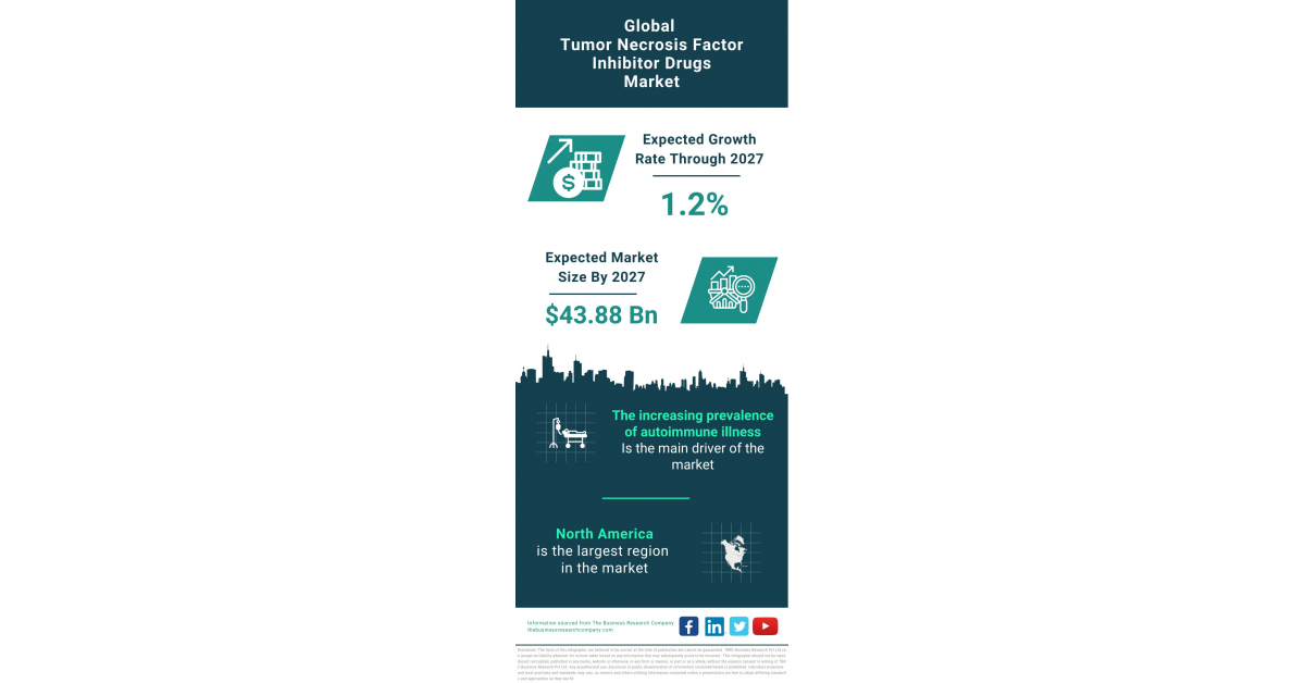 LANDON, GREATER LANDON, UK, November 10, 2023 /EINPresswire.com/ — The global tumor necrosis factor inhibitor drugs market is set to expand steadily, with a projected increase from $41.23 billion in 2022 to $41.84 billion in 2023, demonstrating a Compound Annual Growth Rate (CAGR) of 1.5%. Despite challenges posed by the Russia-Ukraine conflict and the persisting impact of the COVID-19 pandemic, the market is anticipated to reach $43.88 billion by 2027, maintaining a moderate CAGR of 1.2%.