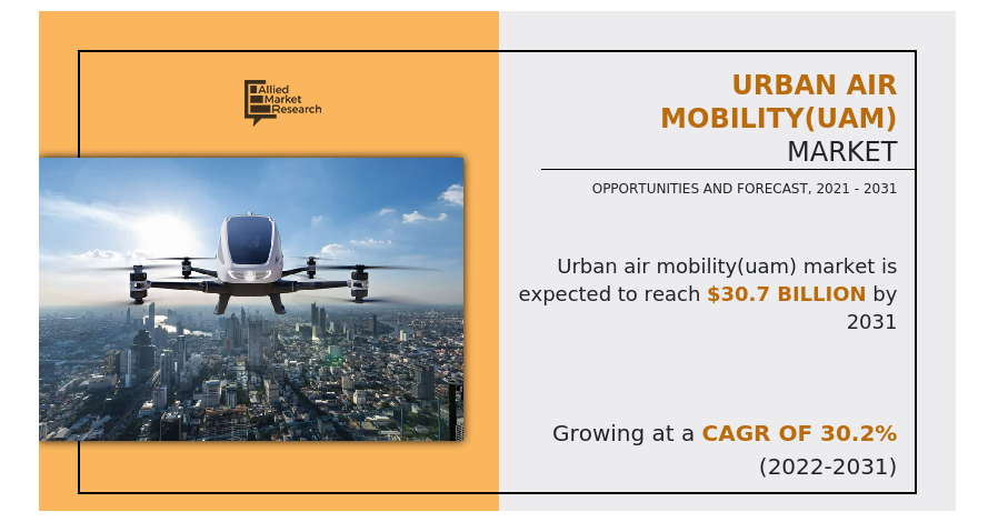 PORTLAND, OREGON, UNITED STATES, June 8, 2023/EINPresswire.com/ — According to a new report published by Allied Market Research, titled, “Urban Air Mobility(UAM) Market,” The urban air mobility(uam) market size was valued at $2.3 billion in 2021, and is estimated to reach $30.7 billion by 2031, growing at a CAGR of 30.2% from 2022 to 2031.