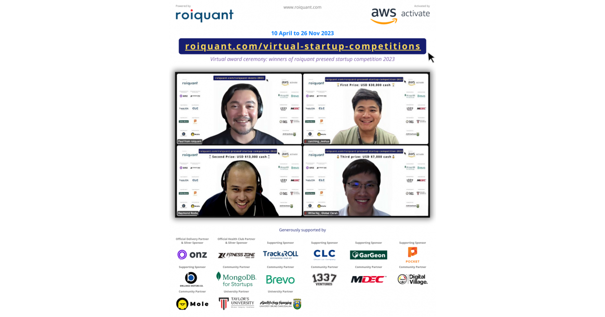 BANDAR SERI BEGAWAN, BRUNEI, December 9, 2023 /EINPresswire.com/ — roiquant, an intelligent decision support system for early-stage startup founders, proudly announced the winners of the 2023 roiquant preseed startup competition at the closing of its virtual startup conference it hosted last Friday, on December 1 2023.