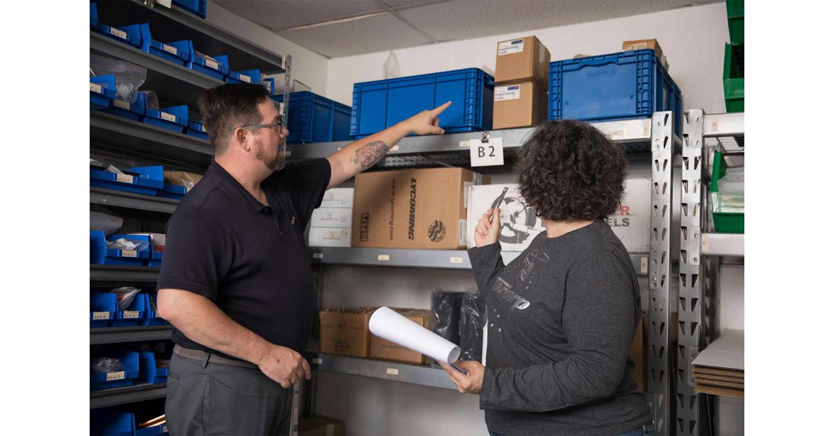 Rotorcorp President Sean Casey reviews stock levels with VP of Operations, Tracy Jensen