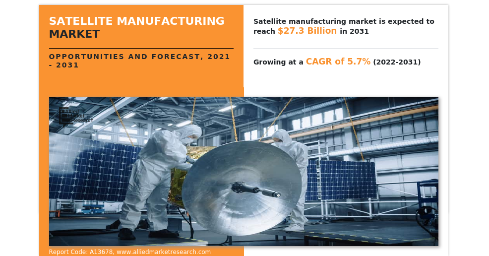 OREGAON, PORTLAND, UNITED STATES , November 2, 2023 /EINPresswire.com/ — Allied Market Research recently published a report, titled, “Satellite Manufacturing Market by Application (Communication, Earth Observation, Navigation, Space Observation, Others), by Satellite Type (LEO, MEO, GEO, Others), by Size (Small, Medium, and Large): Global Opportunity Analysis and Industry Forecast, 2021-2031”. As per the report, the global satellite manufacturing industry was pegged at $16.2 billion in 2021, and is expected to reach $27.3 billion by 2031, growing at a CAGR of 5.7% from 2022 to 2031. The report offers a detailed analysis of changing market trends, top segments, key investment pockets, value chain, regional landscape, and competitive scenario.