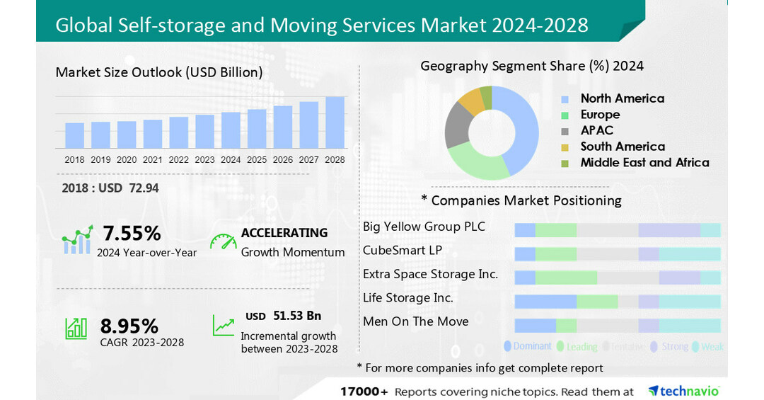 NEW YORK, Jan. 10, 2024 /PRNewswire/ — The self-storage and moving services market is estimated to grow by USD 51.53 billion during 2023-2028. However, the growth momentum will progress at a CAGR of 8.95% during the forecast period. The prospects for the self-storage and moving services market in 2024 appear promising owing to several driving forces. The increasing adoption of self-storage software stands out as a significant factor in enhancing operational efficiency. This software effectively streamlines tasks related to storage accessibility, security, and the management of portable storage containers, catering to the increasing demand for both residential and commercial storage requirements. Moreover, local moving companies are extending their services to include professional packing and unpacking solutions, ensuring the safety of belongings throughout the transit process. Furthermore, the market’s expansion is propelled by the availability of packing materials and specialized vehicle storage solutions, contributing to its projected growth in the upcoming year. Discover some insights on market size & segmentation before buying the full report Download the FREE sample report