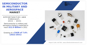 OREGAON, PORTLAND, UNITED STATES , September 7, 2023/EINPresswire.com/ — Allied Market Research published a report, titled, “Semiconductor in Military and Aerospace Market by Component (Sensors, Memory, Opto Electronics, Logic, Micro, Analog, and Others), Technology (Surface Mount Technology and Through-Hole Technology), End Use (Military and Aerospace), and Application (Communication, Navigation, Global Positioning System (GPS) and Surveillance, Imaging, Radar and Earth Observation, Munitions, and Others): Global Opportunity Analysis and Industry Forecast, 2021–2031”. According to the report, the global semiconductor in the military and aerospace industry is expected to generate $6.3 billion in 2021 and is anticipated to generate $12.9 billion in 2031, witnessing a CAGR of 7.6% from 2022 to 2031.