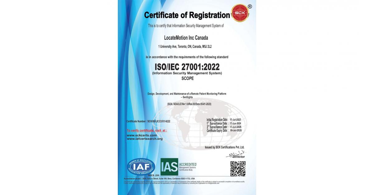 LOS ANGELES, CALIFORNIA, UNITED STATES, August 18, 2023/EINPresswire.com/ — SenSights.AI (o/a LocateMotion Inc.), a recognized leader in an all-in-one “Telemedicine and Remote Patient Monitoring Solution” with a focus on diabetes and hypertension monitoring, has successfully attained the ISO/IEC 27001:2022 certification. This significant accomplishment highlights SenSights.AI’s ongoing efforts to ensure the security of sensitive data and underscores its dedication to maintaining the integrity, confidentiality, and availability of patient information. This comes on the heels of achieving significant “validation” from Ontario Health, this month, for its virtual care and telehealth platform and being already PHIPA and HIPPA-compliant.