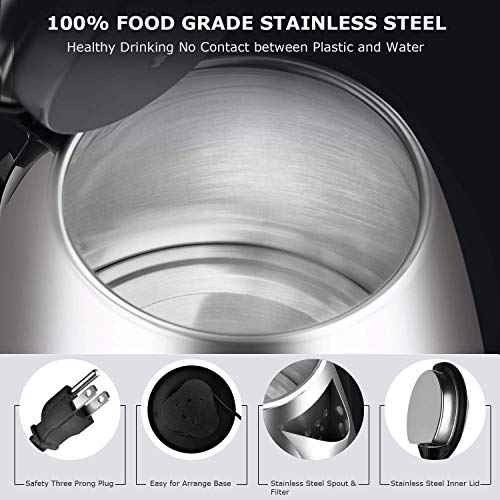 Extra Fast Water Boiler 1500W power makes the boiling more efficient than stove-top and microwave. Large capacity (2L) which slits for a whole family, the water comes to a full boil within 5-6 minutes and will be ready to use for tea, coffee, pasta, hot chocolate, oatmeal, instant soup and so on. Optimal Spout Design Spout design for easy pouring with a reusable, removable perforated stainless steel filter that strains water while you pour. Illuminated Power Indicator This kettle has illuminated power indicator which glows when power is on and darkens when power is off. Single-Touch Lid Locking The single touch-lid locking mechanism ensures a quick seal to prevent steam from escaping and water to boil in no time. Thus making it energy saving. 360 Degree Swivel Base Swivel power base allows you to plug it in any direction with desired jug handle position.