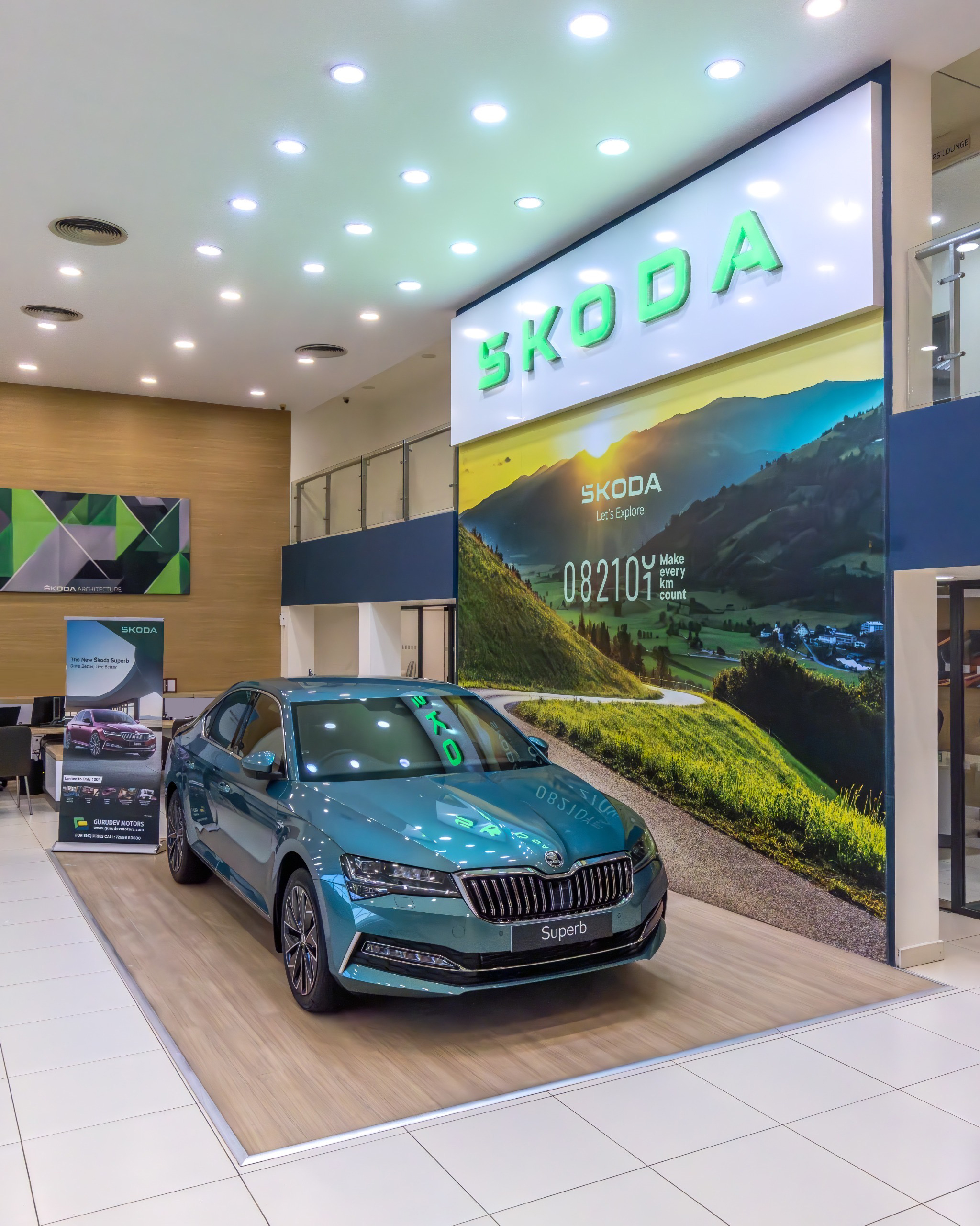 The New Corporate Identity also allows signages in dealership premises the freedom to use the time of the day or night to alter the tone of illumination. The symmetrical and solid lettering lights up sedate Emerald Green in the day and vibrant Electric Green by night maintaining variety yet uniformity with the Škoda signature colours. This aesthetic extends into other finer details of the customer interface complex like the pylon, the dealer branding, the entrance portal and certain highlight walls within.